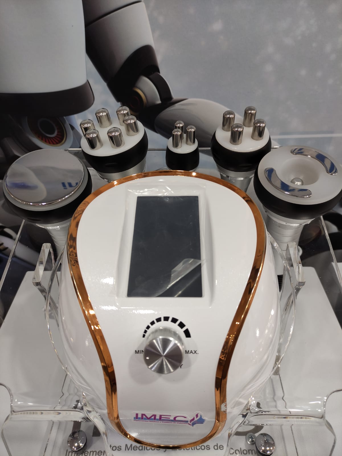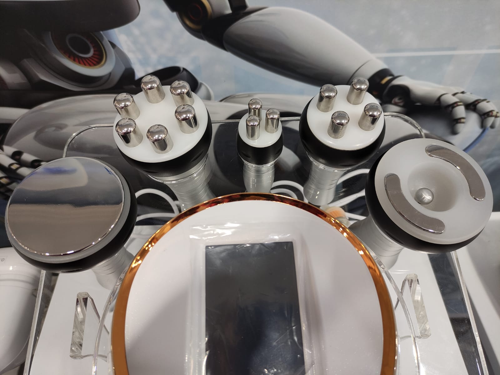 Nuestro equipo de estética corporal Multifuncional 5 en 1 Gold maneja 5 tipos de tratamientos combinados para trabajar en áreas corporales y faciales. Se puede añadir copas de vacum.