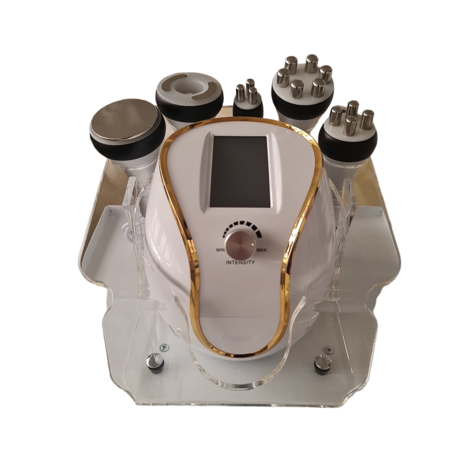 Nuestro equipo de estética corporal Multifuncional 5 en 1 Gold maneja 5 tipos de tratamientos combinados para trabajar en áreas corporales y faciales. Se puede añadir copas de vacum.