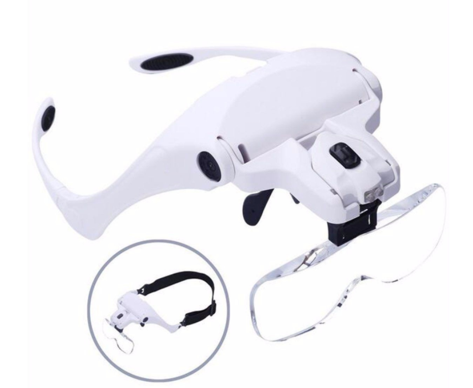 El optivisor de la imagen es una lupa de aumento montada en la cabeza, diseñada para trabajos de precisión con manos libres. Cuenta con cinco lentes intercambiables que ofrecen distintos niveles de aumento. Integra dos luces LED ajustables que permiten iluminar el área de trabajo. Su armazón es ligero y ergonómico, fabricado en ABS resistente. Se puede usar con patillas tipo gafas o banda elástica para mayor comodidad. Es ideal para medicina estética, joyería, electrónica, manualidades y lectura de detalle. *Especificaciones: -Material del cuerpo: ABS (plástico ligero y resistente). -Lentes intercambiables: 5 aumentos (1.0x, 1.5x, 2.0x, 2.5x y 3.5x). -Iluminación: 2 luces LED de alta intensidad, orientables. -Fuente de energía: 3 baterías AAA. -Montura: tipo gafas con opción de banda elástica ajustable. -Peso aproximado: 200 – 250 g. -Color: Blanco. -Uso recomendado: estética, joyería, relojería, reparación de electrónicos, lectura y manualidades.